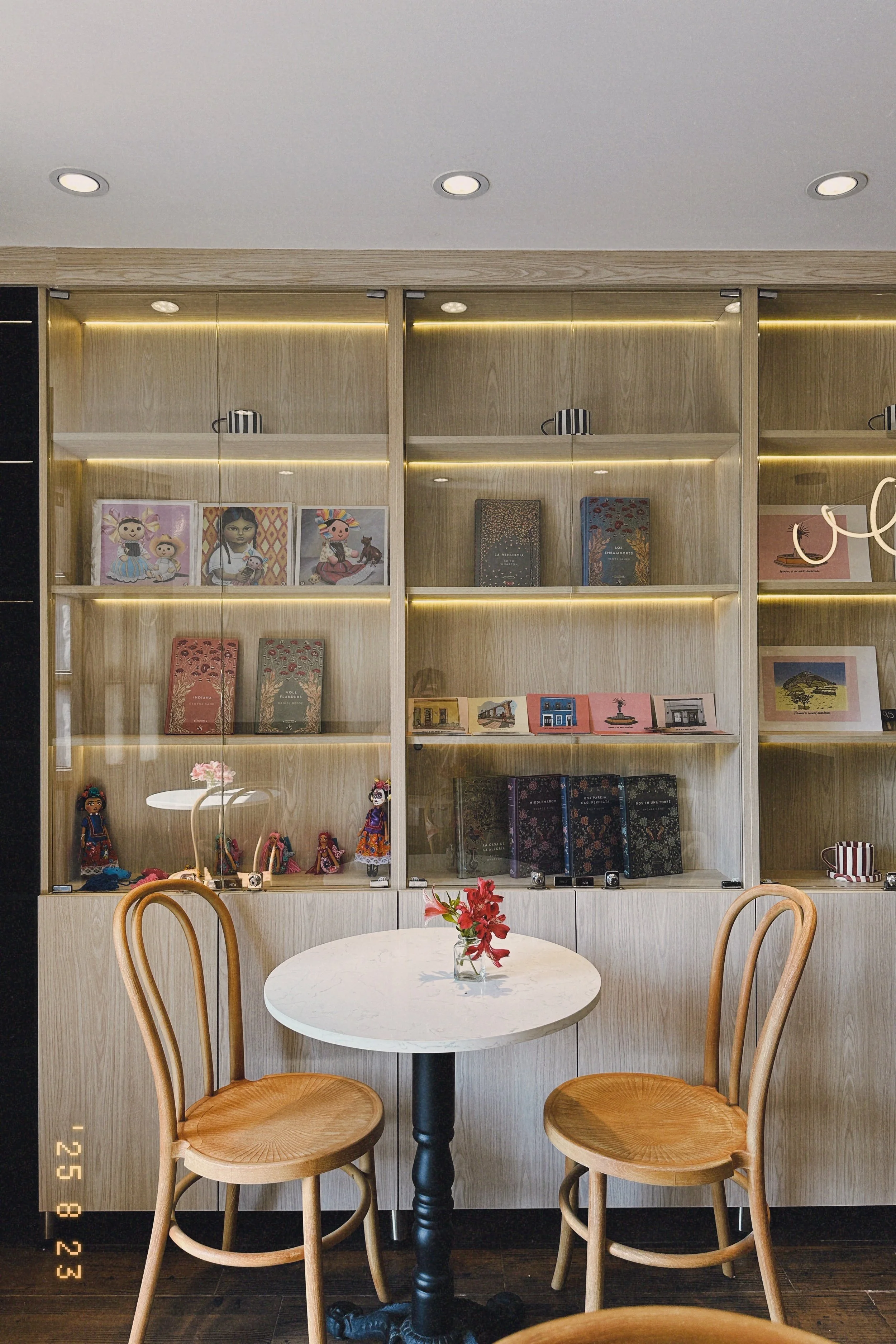 To the left, a lit bookshelf with a fine selection of books: The Ambassadors by Henry James, Indiana by George Sand, The House of Mirth by Edith Wharton, among others. All from the same publishing house, one of those that creates books one longs to touch, smell, and hold for hours. To the right, three marble-and-wrought-iron tables that, in another life, probably held cups and stories under the sun of Nice, slipping through awnings—and in this life, revive themselves within a space of no more than twenty square meters in a city on the American continent.